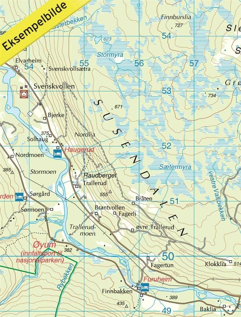 Die Karten verzeichnen Straßen, markierte und unmarkierte Wanderwege (es wird zwischen Sommer- und Winterwanderwege unterschieden), markierte Skikarte, präparierte Skikarte, beleuchtete Skikarte*, Radwege*, Passagierschiffe*, Fährverbindungen* bzw-routen, Campingplätze, Hotels, bewirtschaftete und unbewirtschaftete Hütten, Parkplätze, Krankenhäuser, Krankenstationen, Kirchen, Freizeitmöglichkeiten*, Sehenswürdigkeiten* und alle für die orientierung wichtigen Details. Auf der Rückseite sind touristische Informationen enthalten (auf norwegisch). Die Äquidistanz (Höhenlinien) beträgt 20 Meter.