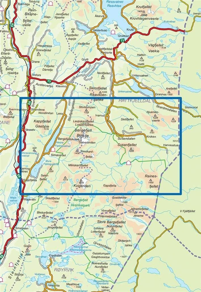 Detaillierte Wanderkarte für Borgefjell nord in Norwegen im Maßstab 1:50.000 von Nordeca.