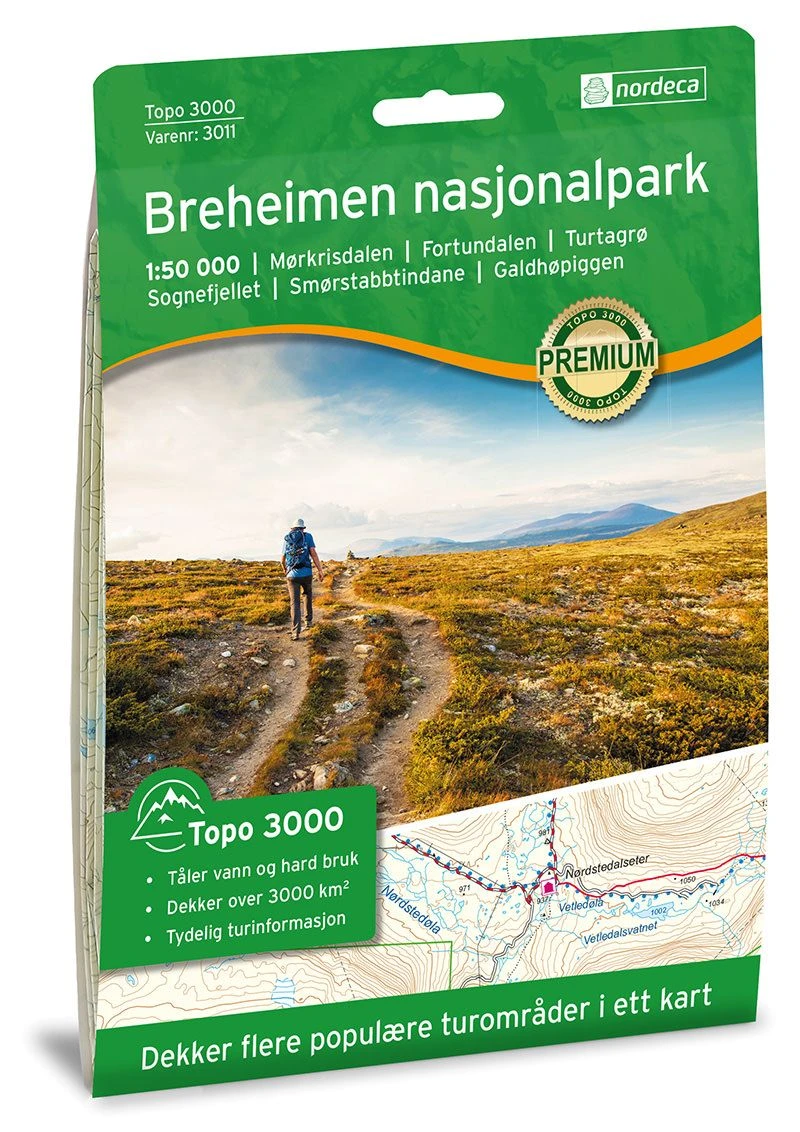 Detaillierte Wanderkarte für Breheimen Nasjonalpark im Maßstab 1:50.000 Blatt 3011 aus der Serie Topo 3000 von Nordeca