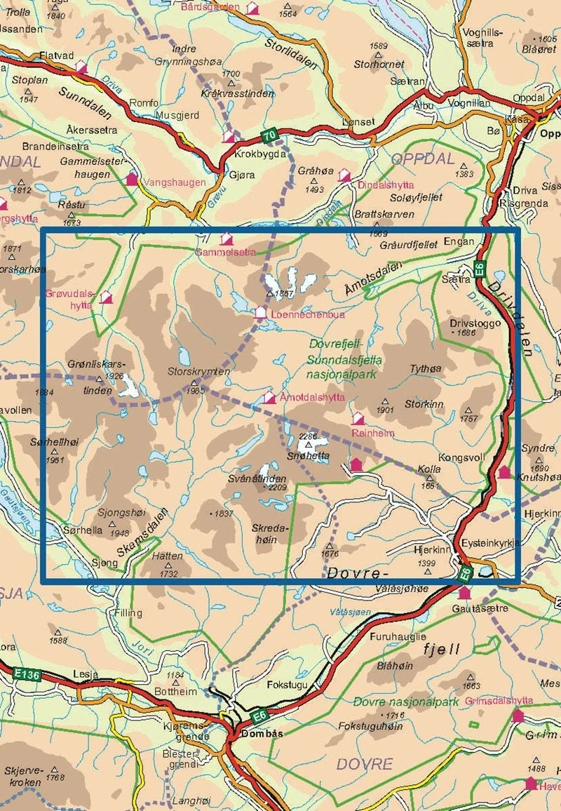 Enthaltene Orte, Berge und Seen: Oppdal, Gjøra, Fjellgardan, Driva, Lønset, Hjerkinn, Snøhetta, Svånåtindan, Snøfjellskollan, Namnlauskollen, Nystugguhøa, Storvatnet, Langvatnet, . Region: Norwegen (Mittelnorwegen), Sogn og Fjordane, Sør-Trøndelag .