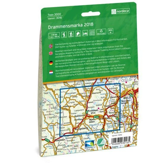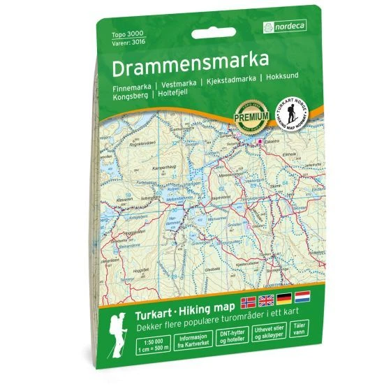 Detaillierte Wanderkarte für Drammensmarka im Maßstab 1:50.000 Blatt 3016 aus der Serie Topo 3000 von Nordeca