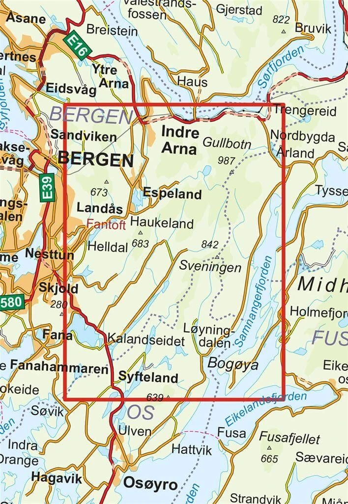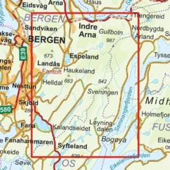 Enthaltene Orte, Berge und Seen: Bergen, Indre Arna, Espeland, Landas, Sandviken, Gullbotn, Haukeland, Sveningen, Syfteland, Loyningdalen, Kalandseidet, Samnangerfjorden.