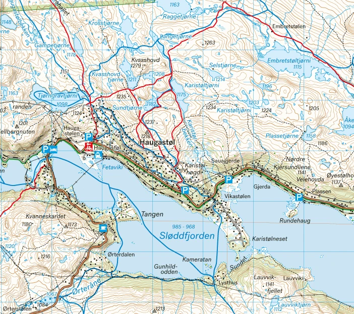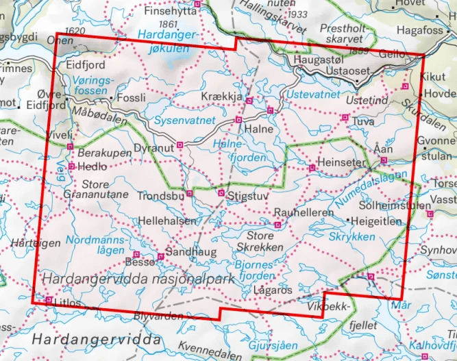 Größere enthaltene Orte, Berge, Punkte: Haugastol, Ustaoset, Tuva, Aan, Heinseter, Heigeitlen, Rauhelleren, Halne, Stigstuv, Lagaros, Sandhaug, Trondsbu, Litlos, Hedlo, Dyranut, Fossli, Sysenvatnet, Halnefjorden, Numedalslagen, Bjornesfjorden, Hardangervidda Nationalpark