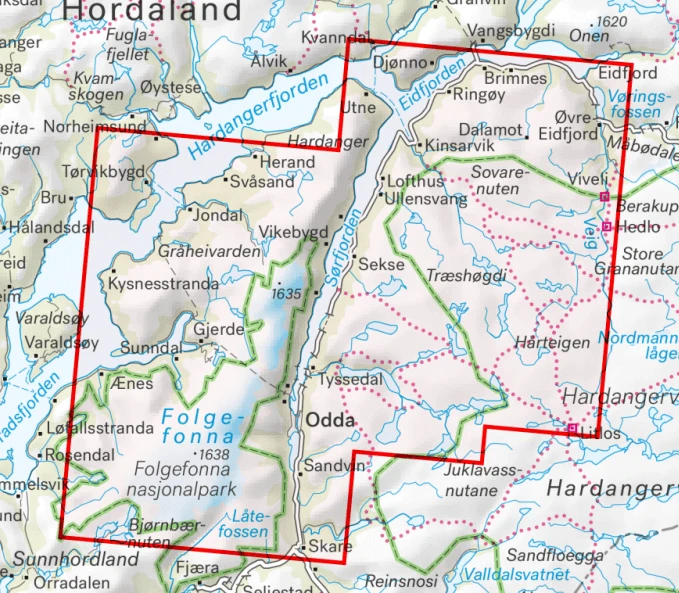 Größere enthaltene Orte, Berge, Punkte: Djonna, Brimnes, Ringoy, Dalamont, Sekse, Tyssedal, Litlos, Odda, Sandvin, Utne, Herand, Jondal, Torvikbygd, Vikebygd, Gjerde, Sunndal, Skare, Folgefonna – Nationalpark, Eidfjorden, Sorfjorden, Hardangerfjorden, Hadangervidda-Nationalpark