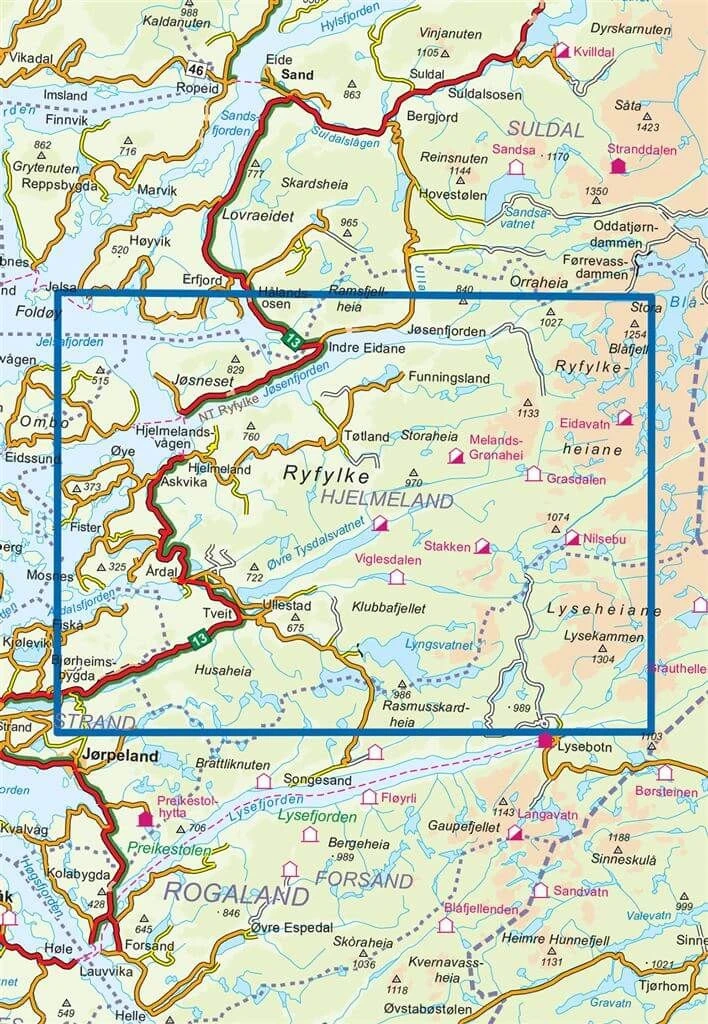 Enthaltene Orte, Berge und Seen: Hjelmelandsvagen, Josneset, Melands-Gronahei, Viglesdal, Bjoreimsbygda, Lysekammen, Lynsvatnet, Ovre-Tysdalsvatret, Josenfjorden
