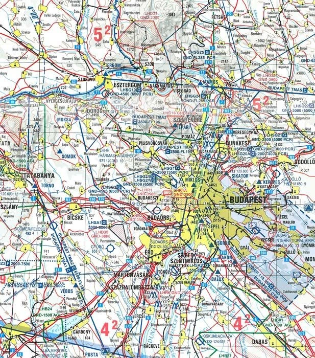 Farbige topographische Grundkarte im Maßstab 1:500.000, mit Flugsicherungsaufdruck und Frequenzen.