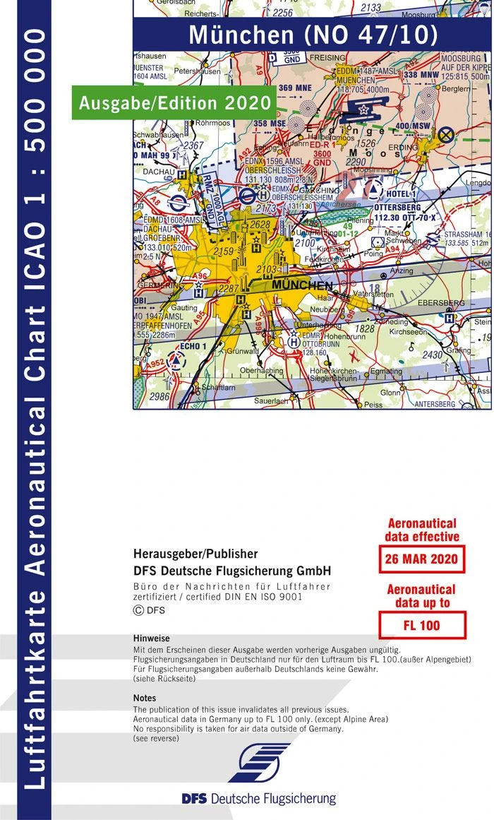 Motorflug München, Ausgabe 2021: Die ICAO-Karte 1:500.000 ist die Standardkarte für die Durchführung von VFR-Flügen und umfasst das Gebiet der Bundesrepublik Deutschland einschließlich dem angrenzenden Ausland (mehrfarbig mit Waldaufdruck und Schummerung). Sie enthält alle wichtigen Topografie- und Flugsicherungsangaben wie z.B.: