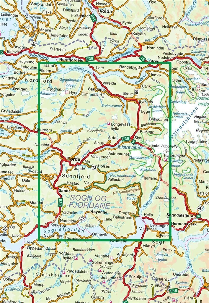 Die Karten sind GPS-kompatibel (UTM WGS84). Die Legende ist 2-sprachig (englisch und norwegisch). Die touristischen Informationen sind allerdings nur auf norwegisch. * Die mit Sternchen markierten Angaben können je nach Karte bzw. Gebiet variieren. Enthaltene Orte, Berge und Seen: Høyanger, Førde, Naustdal, Balestrand, Ålhus, Årdal, Vadheim, Kyrkjebø, Sandane, Skei, Vassenden, Hyen, Sande, Lunde, Byrkjelo, Innvik, Leikanger, Grinde, Vangsnes, Feios, Nordeide, Kupefjellet, Botnafjellet, Gråfjellet, Gjegnet, Blåfjellet, Skorfjellet, Melsnipa, Vatnaskredfjellet, Sognejorden, Haukedalsvatnet, Vikdalsvatnet, Hundvikfjorden, Gloppefjorden, Nordfjord, Storfjorden, Breimsvatnet, Jølstravatnet, Fjærlandsfjorden. Region: Norwegen, Sogn og Fjordane.