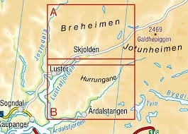 Enthaltene Orte: Luster, Nes Gard, Skjolden, Fortun, Gravdalen, Skagastolsbu, Avdalen gard, Skogadalsboen, Vormeli, Raudnibba, Slettningsbu, Hjelle, Ovre Ardal, Ardalstangen, Vardanosi, Holmevasshytta, Sveikollen, Nordstedalseter, Rovertun Skysstasjon, Krossbu, Ekrehytta, Turtagro, Skjolden, Vigdalstol, Breheimen Nationalpark