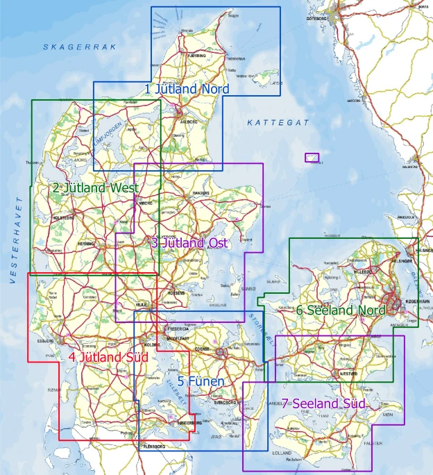 Die neue detaillierte wasserfeste Radkartenserie für Dänemark deckt mit 7 Blättern im Maßstab 1:100.000 gesamt Dänemark ab. Die Karte unterscheidet zwischen 5 verschiedenen Straßenkategorien und verzeichnet Eurovelo-Routen, nationale, regionale und lokale Fahrradrouten, sowie weitere Radwege. Die Karte zeigt außerdem Bahnstationen, Hostels, Campingplätze, Shelter, Zeltplätze, Badestellen, Radläden, Einkaufsmöglichkeiten, Sehenswürdigkeiten, Aussichtspunkte, Krankenhäuser, Wind- und Wassermühlen und Schlösser. Ebenso gibt es hilfreiche Tips und Internet-Adressen zum Fahrradtransport, Brückenüberquerungen, Fähren und Übernachtungsmöglichkeiten. Somit steht dem Erfolg Ihrer Routenplanung nichts mehr im Weg.