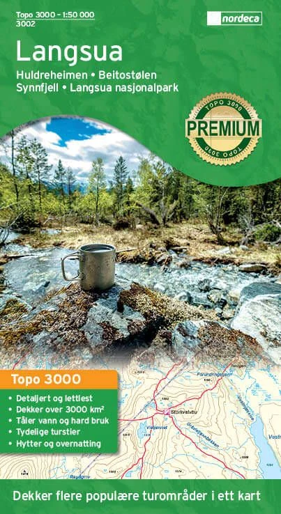Detaillierte Wanderkarte für Langsua im Maßstab im Maßstab 1:50.000 Blatt 3002 aus der Serie Topo 3000 von Nordeca