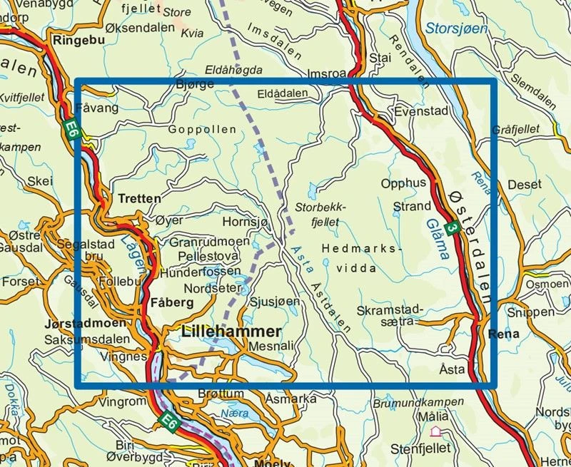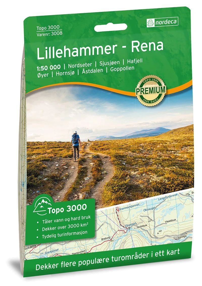 Detaillierte Wanderkarte für Lillehammer Rena im Maßstab 1:50.000 Blatt 3008 aus der Serie Topo 3000 von Nordeca