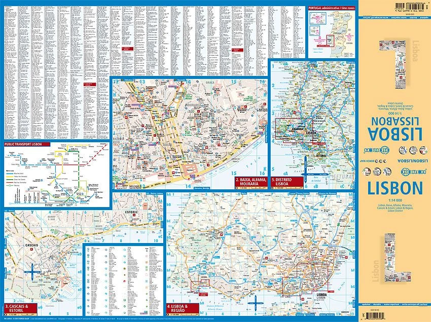 Laminierter Stadtplan von Lissabon mit Umgebungskarte, Karte des Distrikts Lisboa, Vergrößerung der Innenstadt und Cityplan von Cascais und Estoril.