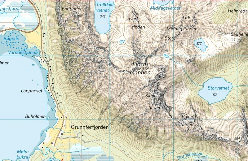 Größere enthaltene Orte, Berge, Punkte: Fiskebol, Austvagoya, Laukvika, Higravtindan, Digermulen, Ulvagen, Helle, Brettesnes, Litlmolla, Skrova, Kabelvag, Orsvag, Henningsvaer, Svolvaer, Sandsletta, Brenna, Laupstad, Higravtindan