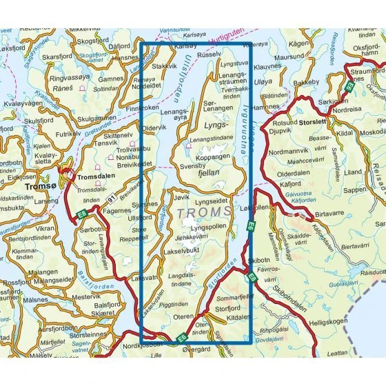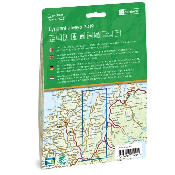 Detaillierte Wanderkarte für Lyngenhalvoya im Maßstab 1:50.000 Blatt 3026 aus der Serie Topo 3000 von Nordeca