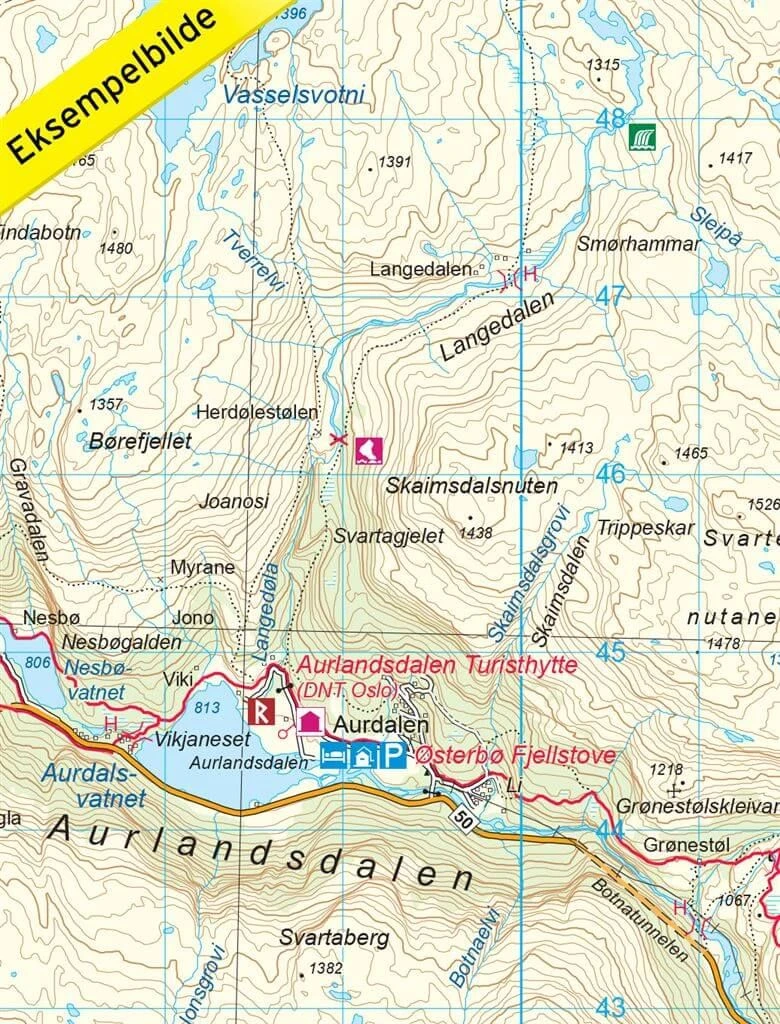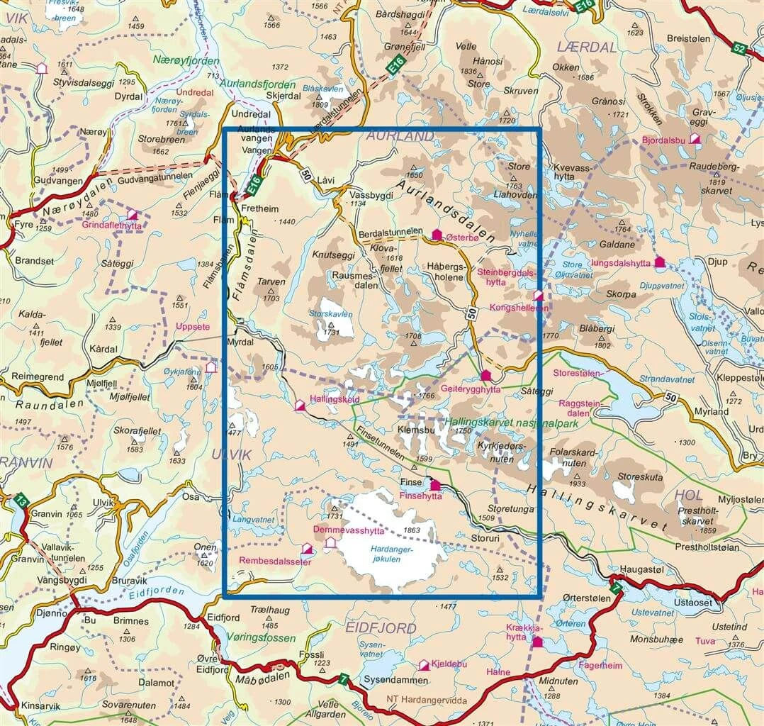 Detaillierte Wanderkarte für Aurlandsdalen in Norwegen im Maßstab 1:50.000 von Nordeca.