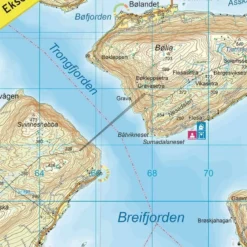 Die Legende ist 2-sprachig (englisch und norwegisch). Die touristischen Informationen sind allerdings nur auf norwegisch. * Die mit Sternchen markierten Angaben können je nach Karte bzw. Gebiet variieren. Enthaltene Orte, Berge, Inseln und Fjorde: Kristiansund, Tingvoll, Kyrksaetør, Surnadalsøra, Rindal, Halsa, Todalen, Bølandet, Vinjeøra, Trollhøtta, Snota, Rognnebba, Reinsfjellet, Trustna, Frei, Straumsnes, Aspøya, Bergsøya, Ertvagsøya, Grisvagøya, Edøya, Skarsøya, Nordlandet, Vinjeforden, Sunardalsfjorden, Korsnesfjorden, Tingvollfjorden, Breifjorden, Halsafjorden, Kvernesfjorden, Arasvikfjorden. Region: Norwegen (Nordnorwegen), Troms. Die Legende ist auf norwegisch und englisch.