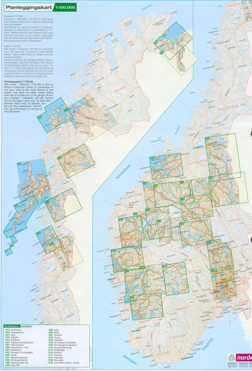 Die wasser- und reißfeste (Tyvek) topographische Wanderkarte im Maßstab 1:100.000 verzeichnet neben zahlreichen Details auch touristische Informationen auf der Rückseite (auf norwegisch!). Die Karten verzeichnen Straßen, markierte und unmarkierte Wanderwege (es wird zwischen Sommer- und Winterwanderwege unterschieden), markierte Skikarte, präparierte Skikarte, beleuchtete Skikarte*, Radwege*, Passagierschiffe*, Fährverbindungen* bzw-routen, Campingplätze, Hotels, bewirtschaftete und unbewirtschaftete Hütten, Parkplätze, Krankenhäuser, Krankenstationen, Kirchen, Freizeitmöglichkeiten*, Sehenswürdigkeiten* und alle für die orientierung wichtigen Details. Auf der Rückseite sind touristische Informationen enthalten (auf norwegisch). Die Äquidistanz (Höhenlinien) beträgt 20 Meter. Die Karten sind GPS-kompatibel (UTM WGS84).