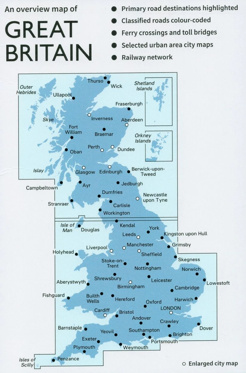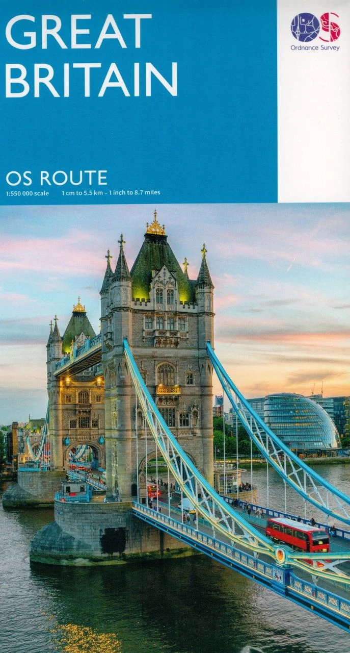 Touristische Straßenkarte im Maßstab 1:550.000, die von Ordnance Survey – der amtlichen Behörde des Vereinigten Königreiches, die verantwortlich für die nationale Landesvermessung Großbritanniens ist – herausgegeben wird. Die Karte verzeichnet Straßen mit Steigungen, Fähren und Fährverbindungen, Eisenbahnlinien mit eine Auswahl an Bahnhöfen bzw. Haltestellen, Flughäfe und Flugplätze, Landschaften, das Relief farblich je nach Höhe und einige touristische Informationen (Park+Ride, ausgewählte Sehenswürdigkeiten, Weltkulturerbestätten, Nationalparks, Landschaftlich schöne Gebiete, Berge und Besucherzentren). Die Karte enthält außerdem Vergrößerungen einiger Stadtgebiete, sowie ein Ortsregister mit den wichtigsten Städten und Orten.