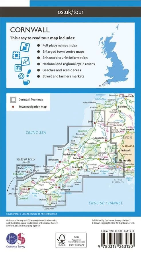 Touristische Freizeitkarte im Maßstab 1:100.000, die von Ordnance Survey – der amtlichen Behörde des Vereinigten Königreiches, die verantwortlich für die nationale Landesvermessung Großbritanniens ist – herausgegeben wird. Die Karte verzeichnet Straßen und Wege mit Entfernungen, nationale Radwege mit Routen-Nummer, regionale Radwege mit Routen-Nummer, Fähren und Fährverbindungen, Eisenbahnlinien mit Bahnhöfen bzw. Haltestellen, Flughäfe und Flugplätze, Bushaltestellen, Landschaften, das Relief farblich je nach Höhe und sehr viele touristische Informationen (Campingplätze, Wohnmobilstellplätze, Motels, Jugendherbergen, andere Unterkünfte, Gaststätten, Parkplätze, Kathedralen, Schlößer, historische Gebäude, Museen, Theater, Kinos, Zoos, Golfplätze, Surfspots, Badestrände, Märkte, Tourismus Informationszentren, öffentliche Toiletten, Sehenswürdigkeiten und viel mehr). Die Karte enthält außerdem Innenstadtpläne, ausgewählte Straßen- und Handwerkermärkte mit Markttagen, ausgewählte Sehenswürdigkeiten und touristische Attraktionen, ein Ortsregister und eine kleine Tabelle mit Erklärungen zu typischen Kornischen Namen.