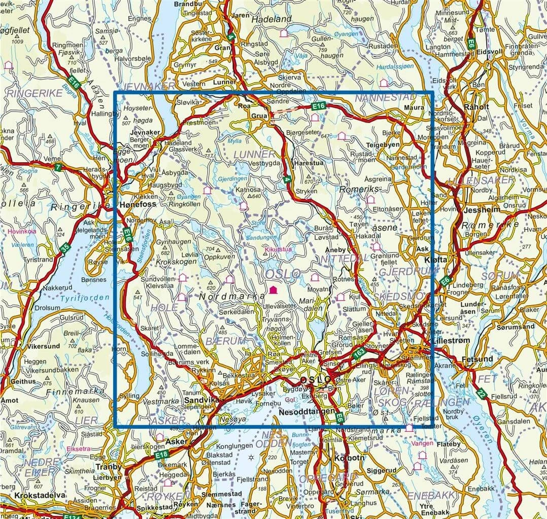 Enthaltene Orte, Berge und Seen: Oslo, Skadvika, Nesoddtangen, Lillestrom, Ask, Aneby, Honefoss, Harestua, Jevnaker, Teigebyen, Maura, Grua, Roa.