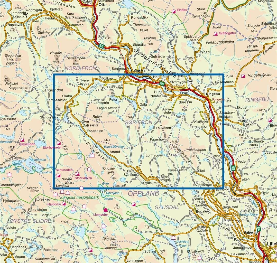 Enthaltene Orte, Berge und Seen: Tverbygda, Kvinke, Harpefoss, Overbygda, Sor-Fron, Ringebu, Frya, Hundorp, Nordre Lia, Gundbrandslia, Skabu, Kampesaetra, Fefor, Lomsetrin, Gala, Bjornstulen, Kvitfjellet, Favang, Losna, Prestkampen, Skei, Austlisaeter, Bennlibygda, Svatsum, Ovre Svatsum, Ongsjofjellet, Nordre Langsua, Ruten, Ovre Dalssaetra, Espedalen, Strand, Longhaugen, Fangerhoy, Lauvasen. Region: Norwegen (SĂĽdnorwegen), Sor-Fron, Oppland, Nord-Fron, Ringebu.