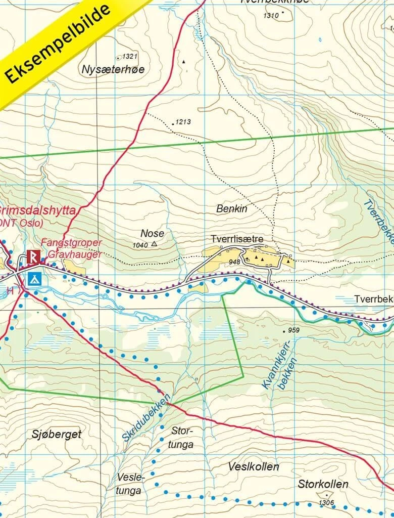 Die topographische Wanderkarte im Maßstab 1:50.000 enthält neben zahlreichen Details auch touristische Informationen. Die Karten verzeichnen Straßen, markierte und unmarkierte Wanderwege (es wird zwischen Sommer- und Winterwanderwege unterschieden), markierte Skikarte, präparierte Skikarte, beleuchtete Skikarte*, Radwege*, Passagierschiffe*, Fährverbindungen* bzw-routen, Campingplätze, Hotels, bewirtschaftete und unbewirtschaftete Hütten, Parkplätze, Krankenhäuser, Krankenstationen, Kirchen, Freizeitmöglichkeiten*, Sehenswürdigkeiten* und alle für die orientierung wichtigen Details. Auf der Rückseite sind touristische Informationen enthalten (auf norwegisch). Die Äquidistanz (Höhenlinien) beträgt 20 Meter. Die Karten sind GPS-kompatibel (UTM WGS84). Die Legende ist 2-sprachig (englisch und norwegisch). Die touristischen Informationen sind allerdings nur auf norwegisch. * Die mit Sternchen markierten Angaben können je nach Karte bzw. Gebiet variieren.