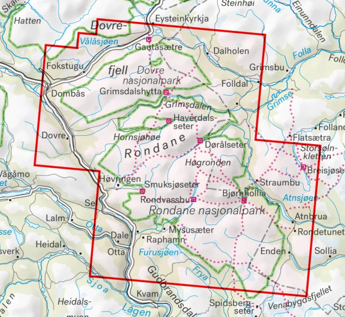 Größere enthaltene Orte, Berge, Punkte: Dalholen, Fokastugu, Dovre, Hovringen, Straumbu, Mysusaeter, Otta, Enden, Dovrefjell, Rondane
