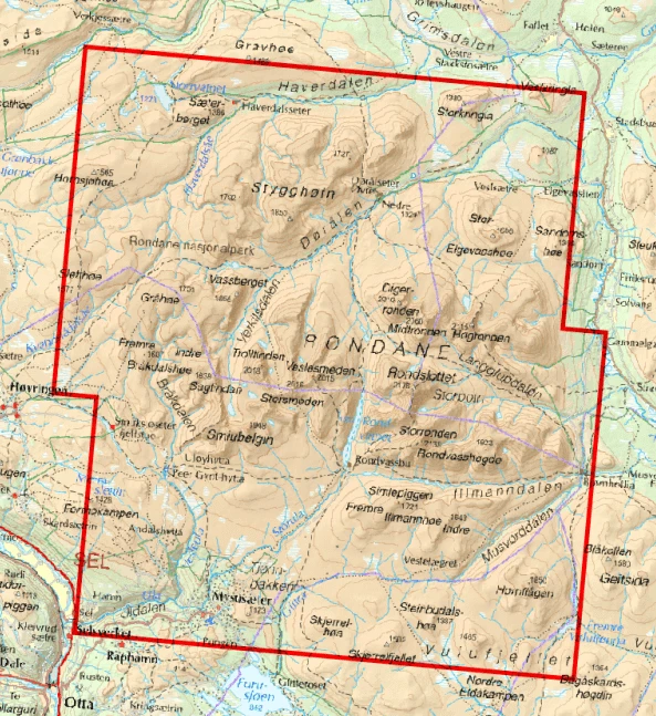 Größere enthaltene Orte, Berge, Punkte: Haverdalsseter, Doralseter, Hornsjohe, Hogronden, Smuksjoseter, Rondvassbu, Bjornhollia, Mysusaeder, Dale, Rondane-Nationalpark