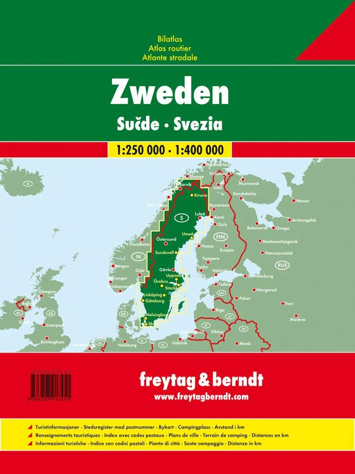 Neben der übersichtlichen Gestaltung verfügt der Straßenatlas Schweden 1:250.00 – 1:400.000 über zahlreiche Zusatzinformationen wie z.B. Straßenbeschaffenheit, Sehenswürdigkeiten, Campingplätze und diverse Innenstadtpläne. Mit dem umfangreichen Ortsregister gelingt zudem eine rasche Orientierung. Touristische Informationen, Ortsregister mit Postleitzahlen, Entfernungen in km, Campingplätze und Stellplätze, Citypläne: Helsingborg, Göteborg, Kiruna, Örebro, Linköping, Malmö, Stockholm, Sundsvall, Umeå, Uppsala; freytag & berndt Autoatlanten sind für viele Länder und Regionen weltweit erhältlich.