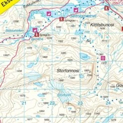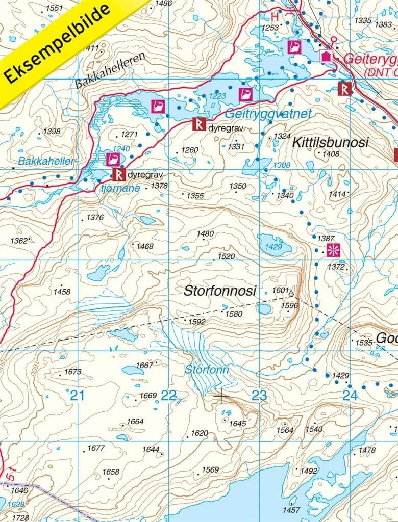 Die topographische Wanderkarte im Maßstab 1:50.000 enthält neben zahlreichen Details auch touristische Informationen. Die Karten verzeichnen Straßen, markierte und unmarkierte Wanderwege (es wird zwischen Sommer- und Winterwanderwege unterschieden), markierte Skikarte, präparierte Skikarte, beleuchtete Skikarte*, Radwege*, Passagierschiffe*, Fährverbindungen* bzw-routen, Campingplätze, Hotels, bewirtschaftete und unbewirtschaftete Hütten, Parkplätze, Krankenhäuser, Krankenstationen, Kirchen, Freizeitmöglichkeiten*, Sehenswürdigkeiten* und alle für die orientierung wichtigen Details. Auf der Rückseite sind touristische Informationen enthalten (auf norwegisch). Die Äquidistanz (Höhenlinien) beträgt 20 Meter. Die Karten sind GPS-kompatibel (UTM WGS84). Die Legende ist 2-sprachig (englisch und norwegisch). Die touristischen Informationen sind allerdings nur auf norwegisch. * Die mit Sternchen markierten Angaben können je nach Karte bzw. Gebiet variieren.