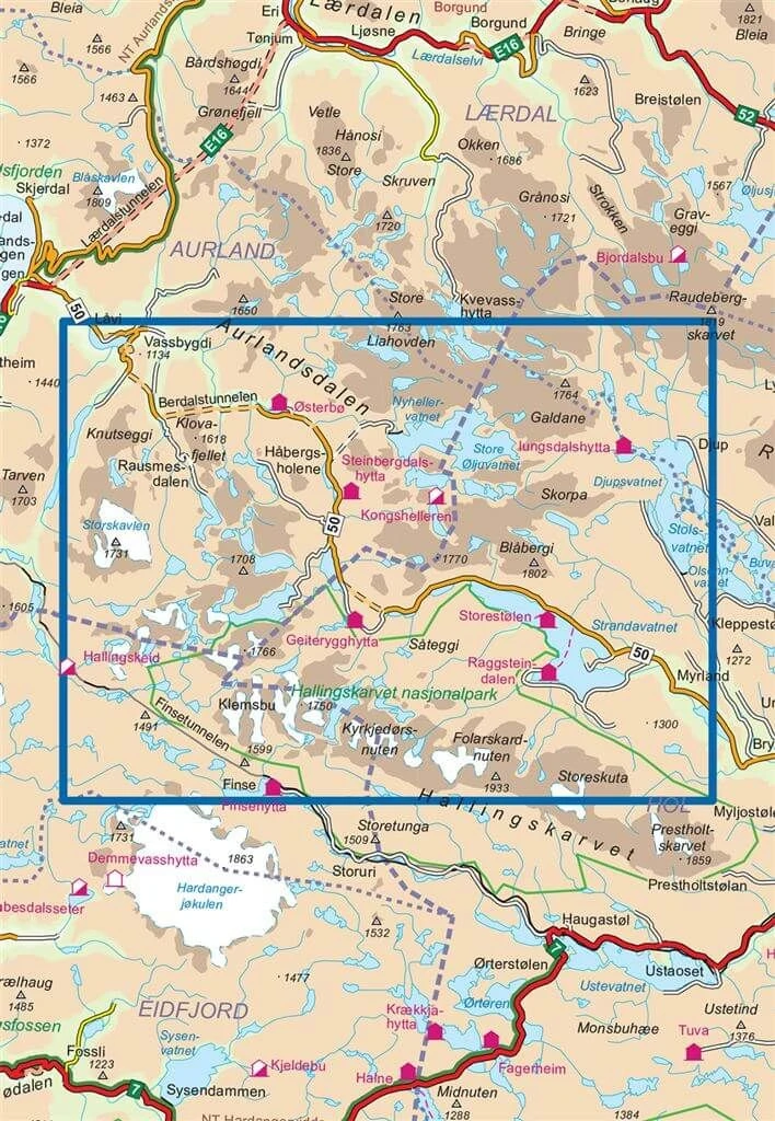 Enthaltene Orte, Berge und Seen: Vassbygdi, Galdane, Skorpa, Blabergi, Folarskardnuten, Finse, Rausmesdalen, Klovafjellet, Habersholene, Rausmesdalen, Stolsvatnet, Store Oljuvatnet, Strandavatnet. Region: Norwegen (SĂĽdnorwegen), Aurlandsdalen, Aurland, Hallingskarvet Nationalpark.