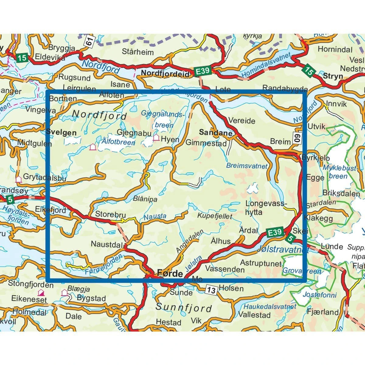 Enthaltene Orte, Seen, Täler, Berge und Gletscher: Skei, Sandane, Førde, Ålfotbreen, Eikefjord, Grovabreen, Trollebottsegga, Ålhus, Naustdal, Longevasshytta, Storebru, Breimsvatnet, Jølstravatnet