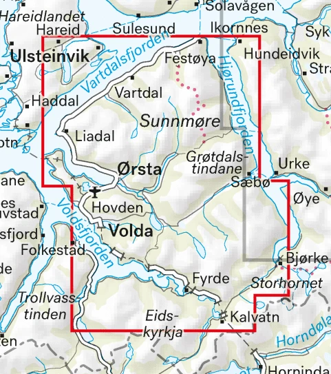 Größere enthaltene Orte, Berge, Punkte: Hareid, Ulsteinvik, Vartdal, Festoya, Liadal, Hovden, Orsta, Volda, Fyrde, Saebo, Grotdalstindane, Bjorke, Kalvatn