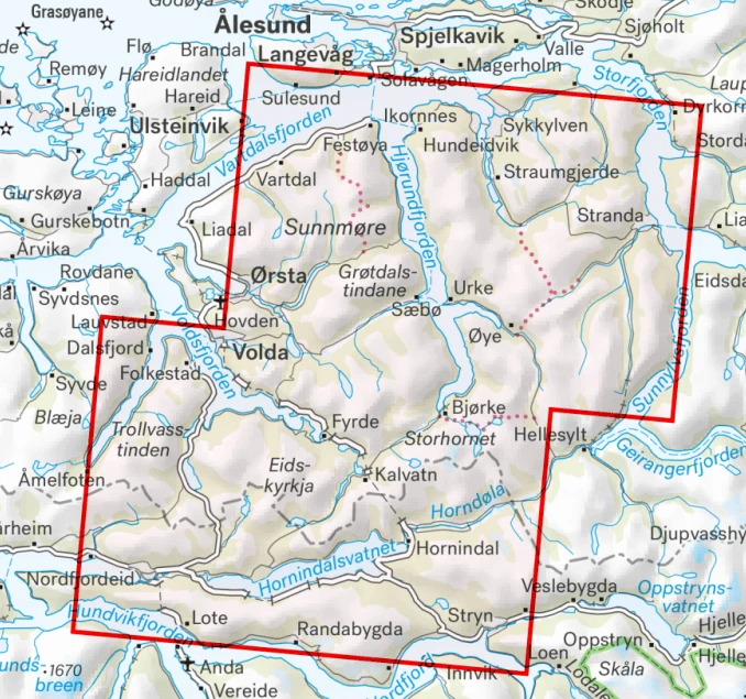 Größere enthaltene Orte, Berge, Punkte: Volda, Orsta, Stryn, Lote, Dalsfjord, Vartdal, Sulesund, Ikornnes, Stranda, Urke, Fyrde, Hjorungdfjorden, Hornindalsvatnet