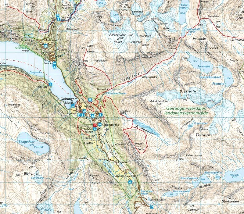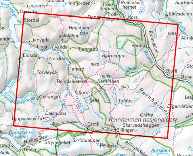 Größere enthaltene Orte, Berge, Punkte: Djupvasshytta, Grotli, Bjorli, Hogstolen, Liabygda, Tafjord, Kartinden, Torsbu, Verma, Ulvaa, Rauma