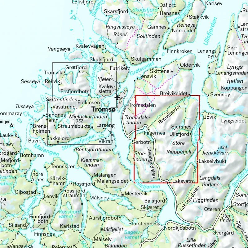 Größere enthaltene Orte, Berge, Punkte: Tromsdalen, Tromsdalstinden, Sjursnes, Ullsfjord, Store Rieppefjell, Sorbotn, Stortinden, Lavangsdalen