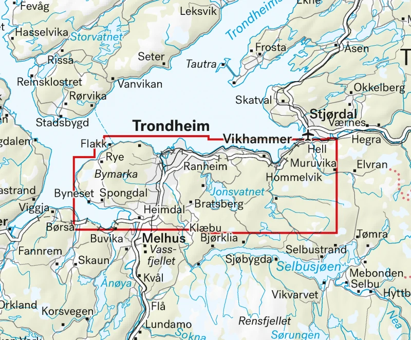 Größere enthaltene Orte, Berge, Punkte: Flakk, Rye, Bymarka, Trondheim, Vikhammer, Ranheim, Hell, Muruvika, Hommelvik, Bratsberg, Heimdal, Spongdal, Byneset, Klaebu, Jonsvatnet