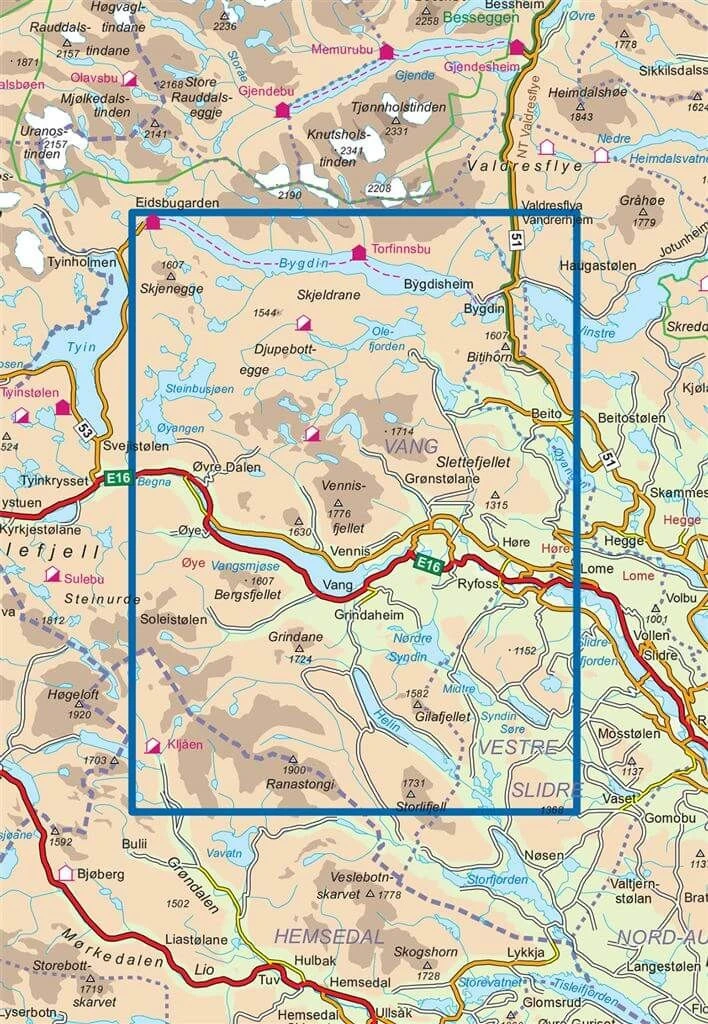 Enthaltene Orte, Berge und Seen: Skjenegge, Bygdisheim, Bygdin, Bitihorn, Ovre Dalen, Oye, Vennisfjellet, Beito, Gronstolane, Hore, Ryfoss, Vennis, Vang, Bergsfjellet, Soleistolen, Grindane, Grindaheim, Gilafjellet, Storlifjell, Ranastongi.