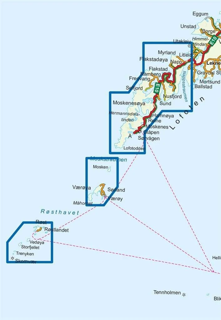 Enthaltene Orte, Berge und Seen: Flakstadøy, Moskenesøya, Værøy, Røst, Reine, Moskenes, Flakstad, Fredvang, Hermannsdalstinden, Måhornet. Region: Norwegen (Nordnorwegen), Nordland.
