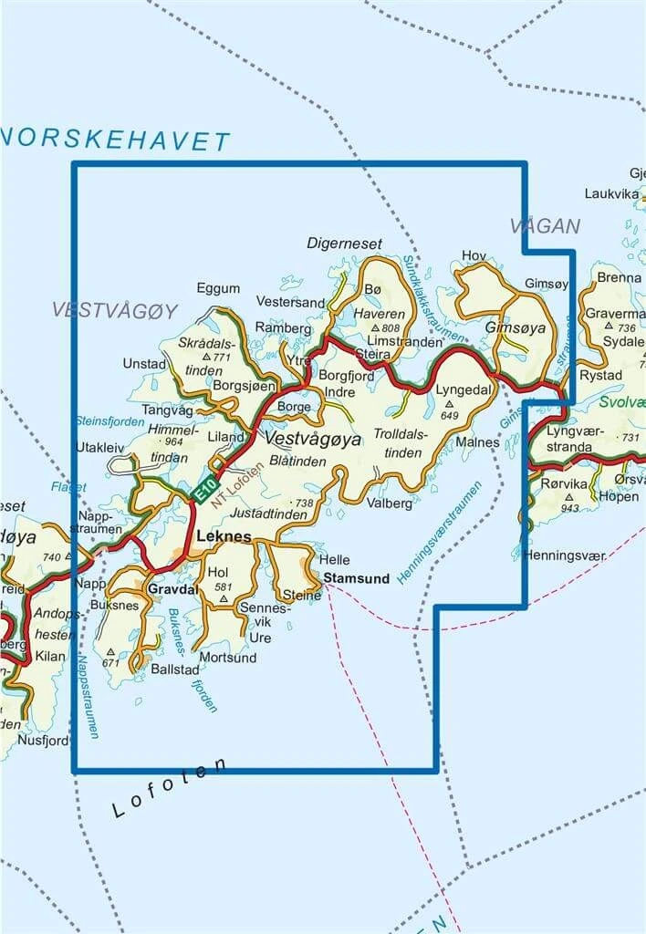 Enthaltene Orte, Berge und Seen: Leknes, Stamsund, Helle, Mortsund, Ballstad, Gravdal, Eggum, Unnstad, Borge, Haveren, Himmeltindan.
