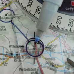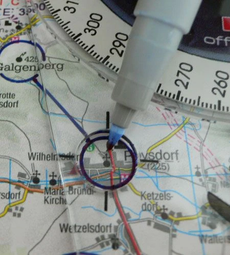 •Mit der am Navigationszirkel befindlichen Kreisschablone können Streckenpunkte in der Karte mit einem Kreis umrandet und zur weiteren Bestimmung des Steuerkurses miteinander verbunden werden (Koppelnavigation)
