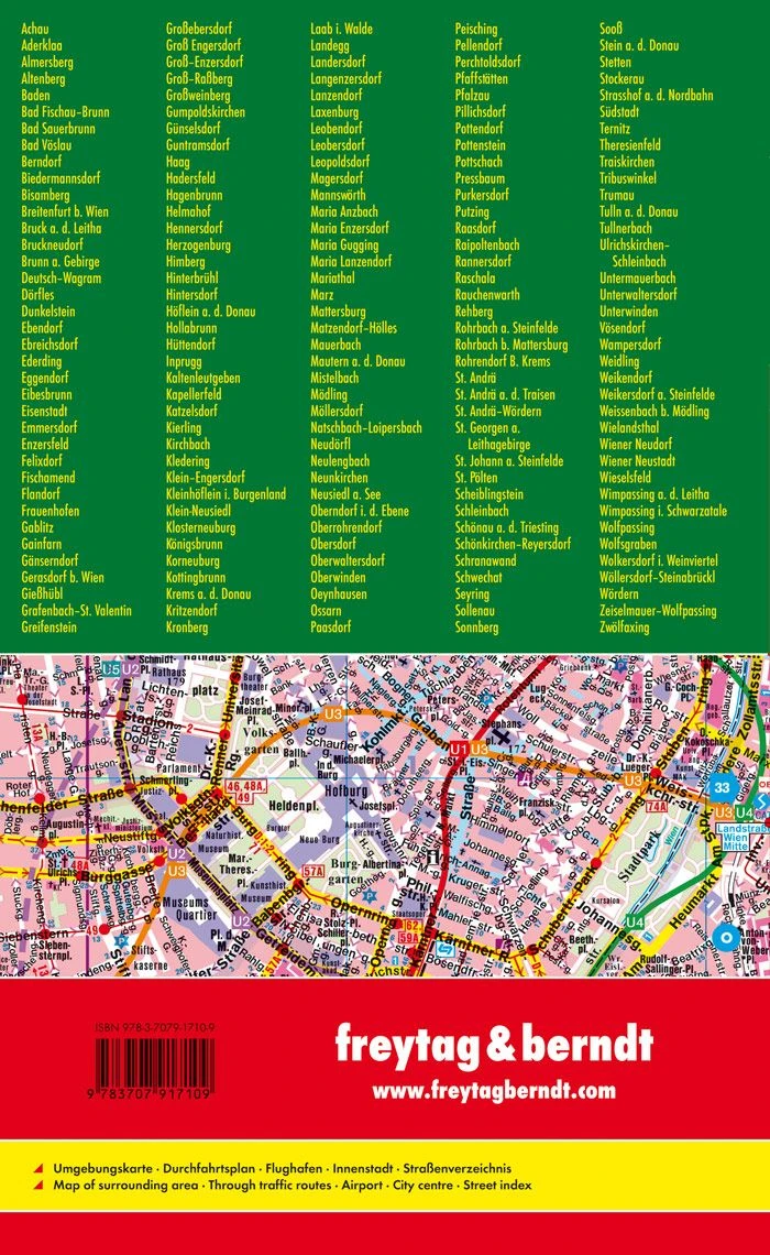 freytag & berndt Stadtpläne sind für viele internationale Hauptstädte sowie zahlreiche Städte und Orte im In- und Ausland erhältlich. Mit den handlichen Faltplänen und praktischen Buchplänen findet man sich dank der genauen Maßstäbe und des übersichtlichen Kartenbilds überall gut zurecht. Der Städteatlas “Großraum Wien 1:15.000” ist in Extra großer Schrift gedruckt und bietet zahlreiche Zusatzinformationen wie einen U-Bahn-Plan, Innenstadt-Plan, öffentliche Verkehrsmittel und Sehenswürdigkeiten. Im umfangreichen Index finden Sie außerdem jede Adresse. Alle Inhalte werden natürlich regelmäßig aktualisiert. Großformat A4, Einbahnen, Kurzparkzonen, Innenstadtplan, Straßenverzeichnis, Firmenstandorte, Sehenswürdigkeiten, Öffentliche Verkehrsmittel, Flughafen Wien, Durchfahrtsplan, Autokarte Großraum Wien 1:225.000;